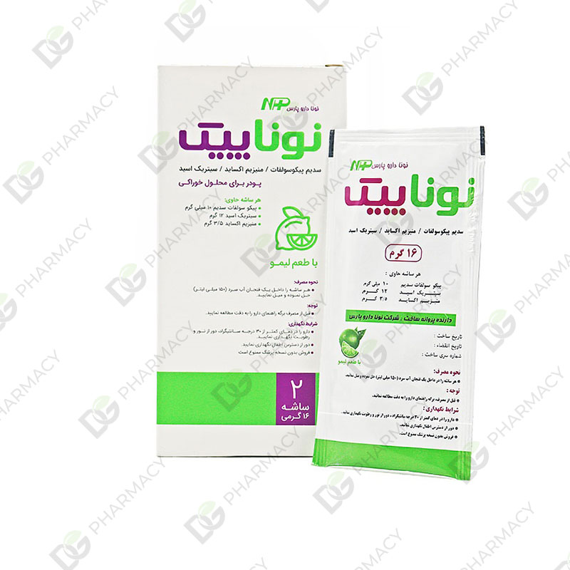 هر ساشه محتوی 10 مملی گرم پیکوسولفات سدیم ، 12 میلی گرم سیتریک اسید و 3.5 میلی گرم منیزیم اکساید می باشد.