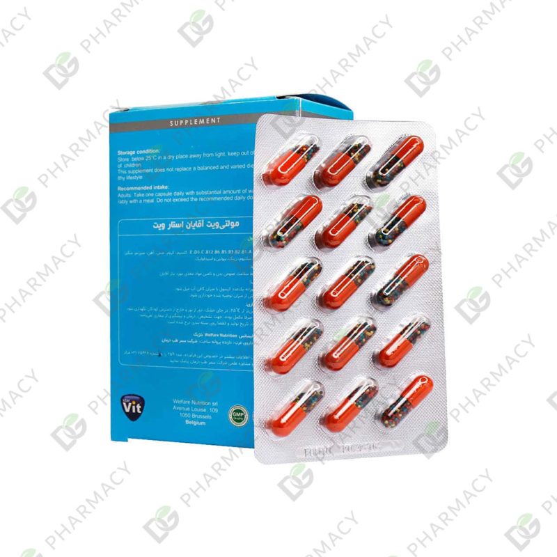 مولتی ویتامین استار ویت آقایان، مکمل تغذیه ای به شکل دارویی کپسول است و برای کمک به حفظ سلامت عمومی بدن و تأمین نیازهای تغذیه ای آقایان کاربرد دارد. مولتی ویتامین استار ویت آقایان، حاوی مولتی ویتامین در کنار مواد معدنی همچون کلسیم، کروم، مس، منیزیم، ید، سلنیوم، زینک و آهن است و دوز آهن به کار رفته در آن برای آقایان قابل استفاده است. multivit for men استار ویت، علاوه بر رفع نیاز و جلوگیری از کمبود، به تأمین انرژی مورد نیاز، حفظ و تقویت سلامت استخوان ها و عضلات، بهبود عملکرد سیستم ایمنی، تقویت سلامت مو و بهبود قوای جنسی نیز کمک می کند. مولتی ویتامین مخصوص آقایان استار ویت، در جعبه های مقوایی 60 عددی حاوی 4 بلیستر 15 تایی تحت لیسانس Welfare Nutrition بلژیک و توسط سمر طب درمان در ایران تولید می شود.