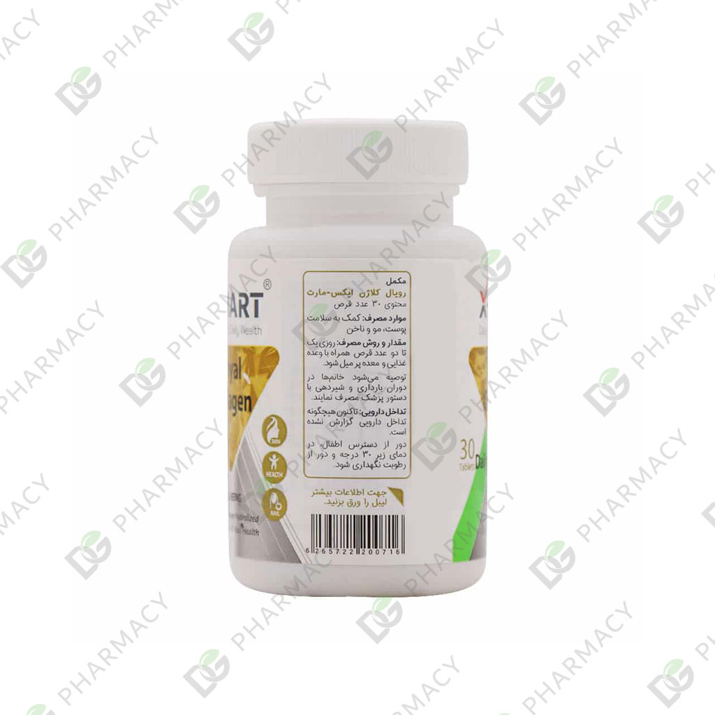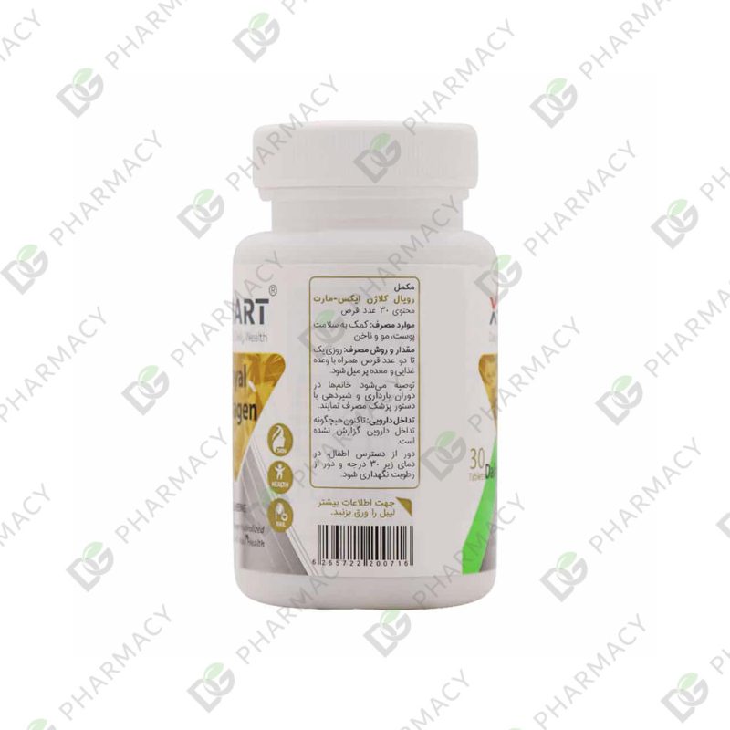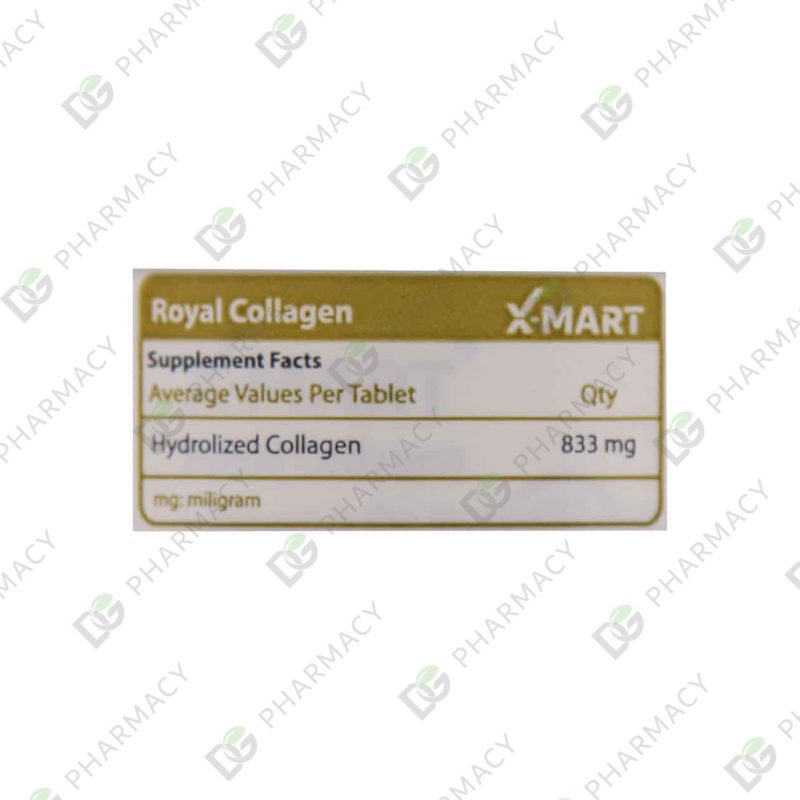 قرص رویال کلاژن ایکس مارت یک مکمل کلاژن است که با داشتن کلاژن هیدرولیز شده نوع ۱ و ۳، به سلامت پوست، مو و ناخن کمک میکند. در هر قرص رویال کلاژن ایکس مارت مقدار ۸۳۳ میلی گرم کلاژن از نوع هیدرولیز شده وجود دارد که ظاهر پوست را بهبود میبخشد. استفاده از قرص کلاژن منجر به افزایش آبرسانی، افزایش خاصیت ارتجاعی و استحکام، کاهش چین و چروک و جوان سازی پوست میشود. علاوه بر آن کلاژن هیدرولیز شده در افزایش استحکام ناخنها و کاهش دفعات شکستن آنها موثر است. |